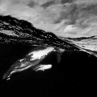 • During a stormy day at sea, a humpback whale calf glides effortlessly below.