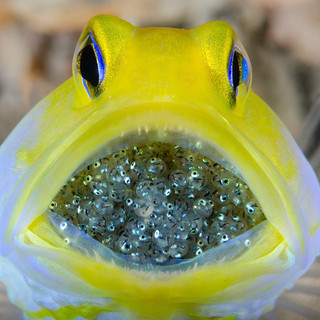 • A male yellowhead jawfish mouthbrooding its eggs until they are ready to hatch.